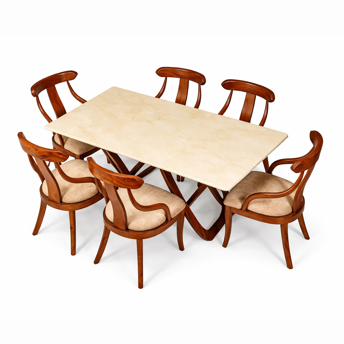 Solid Seasoned Mahogany Wood, Solid Rubber Comfort foam, Walnut Colour Lacquer Finish, Turkish Genuine Marble, Imported Fabric (Fabric can be Customised).