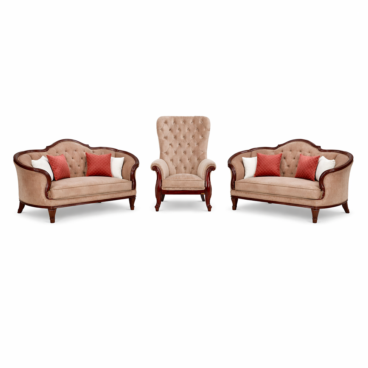 Solid Seasoned Mahogany Wood, Semi Soft Rubber foam, Antique Colour Lacquer Finish, Foreign Fabrics (Fabric can be Customised).